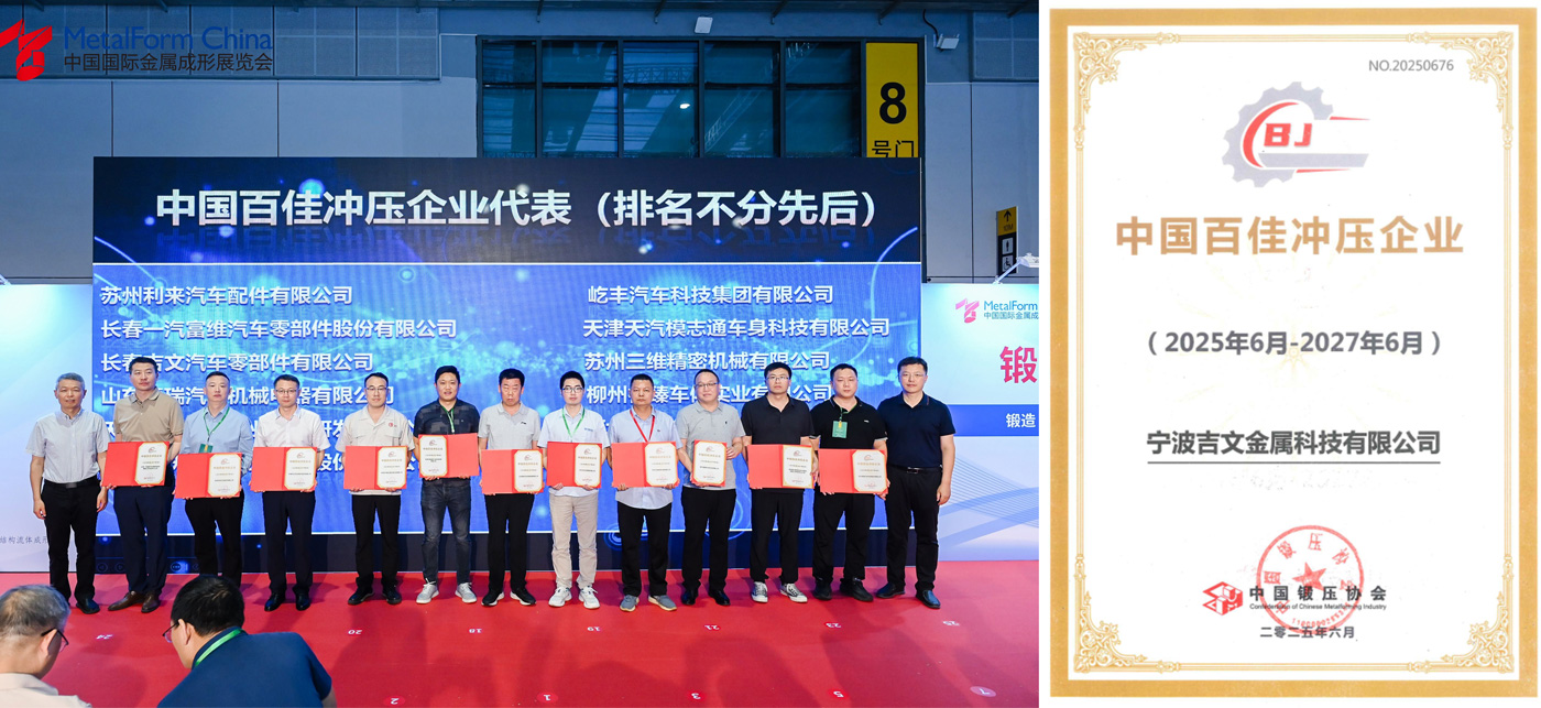 2025年6月17日至20日,2025中國國際金屬成形展覽會(METALFORM CHINA2025)在國家會展中心(上海)隆重舉行。展會期間,2025中國國際經(jīng)濟與金屬成形行業(yè)發(fā)展論壇暨沖壓行業(yè)"百佳零部件企業(yè)"頒獎典禮成功舉辦,吉文金屬技術(shù)總監(jiān)丁大海先生代表公司應(yīng)邀出席本次活動。